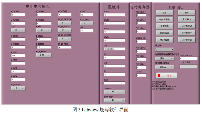 (1)芯片上电,电流18mA左右,将进入写模式,运行labview程序,点击图4界面中的【软写】、【自校准CB】 (2)根据需求,对照第表3、4中的寄存器说明,调节相应的参数。 (3)见表5所述,可通过写临时寄存器监测内部信号。 注:软写模式下,断电后写入的数据就没有了。要在软写模式下测试,写入后需要一直保持上电状态,但烧写器可以去掉。