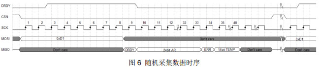 芯片默认数据采集模式时 Normal 模式。图 6 为 Normal 采集数据时序。当内部数据更新时,DRDY 置为 ‘1’,当数据被 SPI 采集后,DRDY 置为‘0’直至新的数据被更新,DRDY 再次被置为‘1’。DRDY 在数 据中的具体位置,受寄存器 READ_DATAONLY 控制,当 READ_DATAONLY=1 时,DRDY 在数据的第 25 位, 默认 READ_DATAONLY=0 时,DRDY 在数据的第 1 位。
