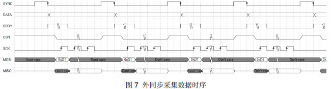 配置寄存器 SYNC_EN=1,芯片进入 SYNC 模式。图 7 为 SYNC 模式采集数据时序,采用下降沿同步数 据。SYNC 引脚下降沿锁定数据,DRDY 置为‘1’,当数据被 SPI 采集后,DRDY 置为‘0’直至新的同步沿 到来,数据再次更新,DRDY 再次置为‘1’。
