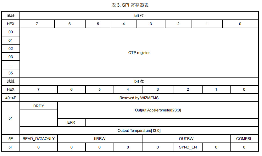 加速度数据输出为 24bit,温度数据输出为 14bit,在数据最高位之前加入了 1bit 的新数据标 志位 DRDY,所以外部 SPI 主机可以同时读取加速度数据和温度传感器数据,客户根据自己所 需采集的数据,参考下列格式进行配置及采集, DRDY 在每个新数据的起始时被设置为‘1’, 当采样数据被读取后自动恢复为‘0’,所以每个读取的加速度数据都应该判断 DRDY 以保证这 是一个不重复的新数据,这里要求 SPI 的数据采样率稍稍略高于加速度数据输出速率以保证数 据不会丢失,数据输出率为 31.25KHz。SPI 读取加速度数据命令形式