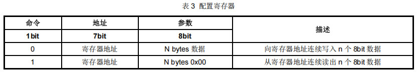 本 ASIC 内部寄存器及数据的读取和写入格式如图 6 所示,第一 Byte 的最高位为读写标志 位,为‘1’表示接下来为读取操作,为‘0’则表示接下来为写入操作,第一 Byte 的低 7 位为 地址位,对应表 2 寄存器表。