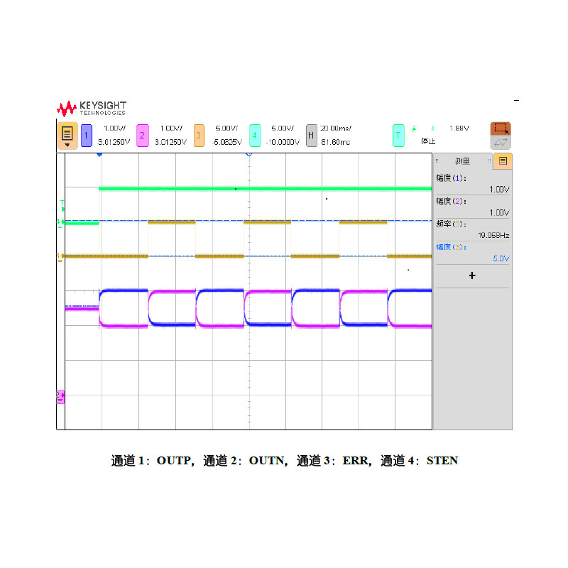 AS1000A加速度计具有自检测功能。自检时,第11引脚STEN拉高至5V即可。自检测模式下,若加速度计正常工作,则自检测输出引脚ERR及传感器件差分输出OUTP和OUTN将输出19Hz左右的周期性方波,如图2所示。其他模式下自检测输出引脚ERR均为低电平。